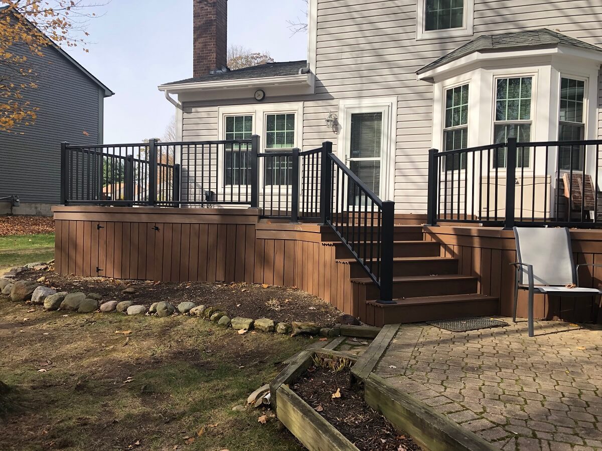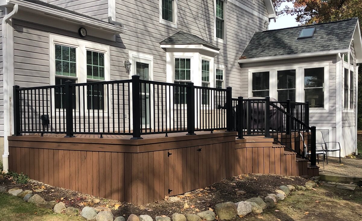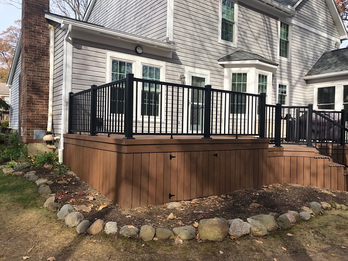 For their new deck, the homeowners selected this beautiful TimberTech Pro Terrain decking in the Brown Oak color with black aluminum railing. We also used the same TimberTech composite boards for the deck skirting and access door for storage underneath.