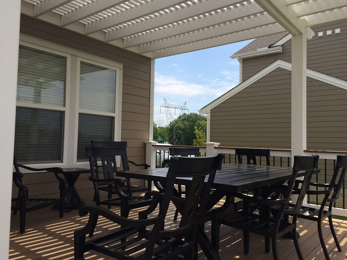 Including a custom pergola with your deck or patio design can be a cost-effective alternative to adding a covered porch or patio. A pergola is going to be less expensive than a roof. Our design consultant will work with you to design the best shade structure to blend with your home and fit your budget, too.