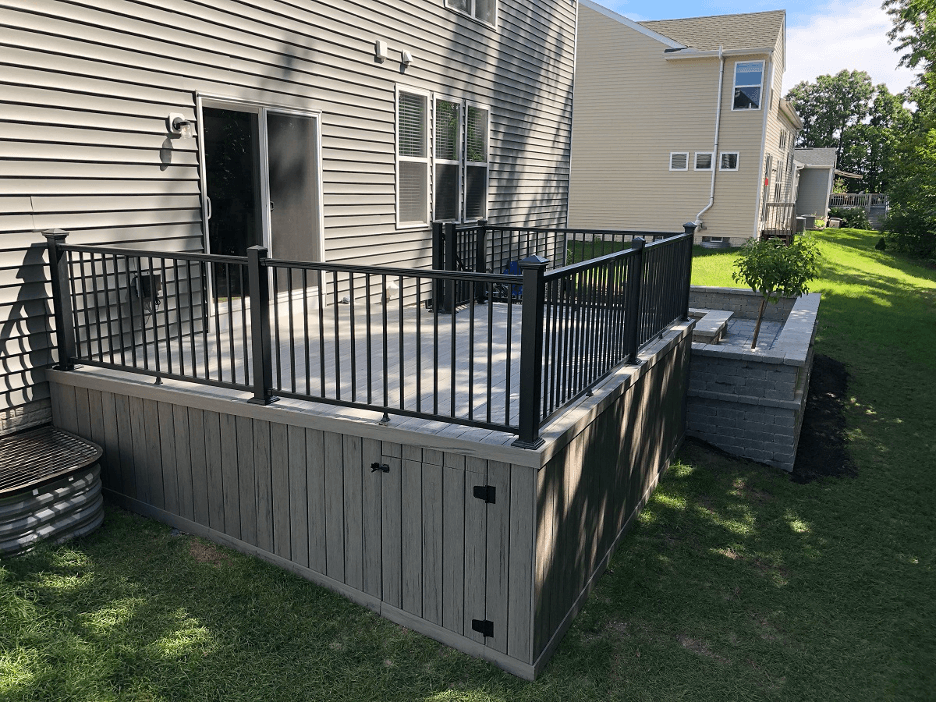 The deck was built using TimberTech Pro Reserve decking in the color Driftwood. Archadeck of Columbus used this same decking for the skirting to give the design a high-aesthetic using monochromatic hues. We topped off the space with an black aluminum rail.