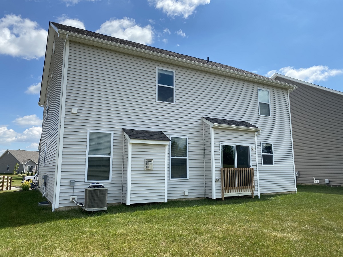Outside the rear of this home was just a lonely air conditioner and a wooden protective gate outside of the kitchen “patio” doors – only there was no patio to be found – just lawn.