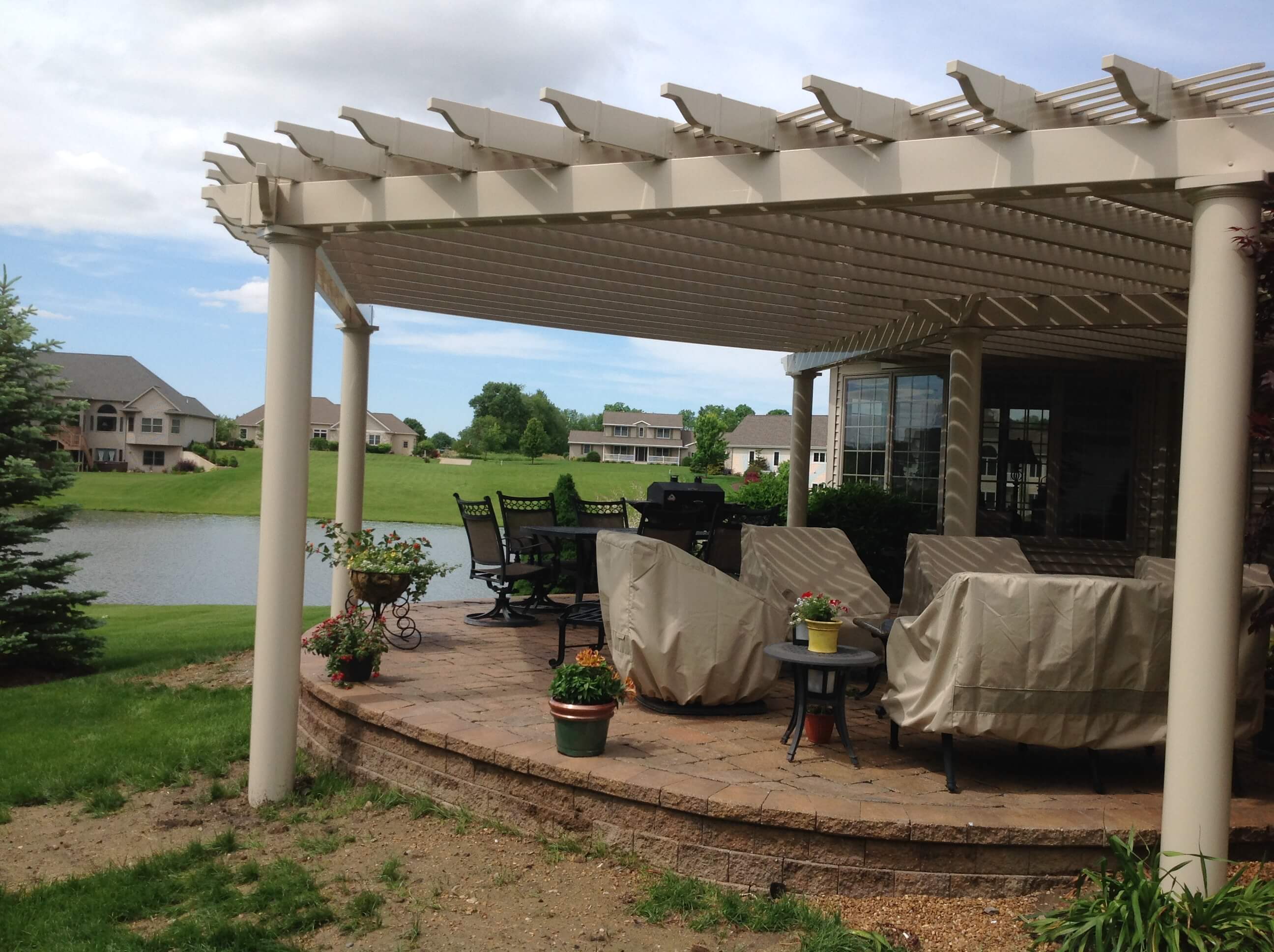 This stunning vinyl pergola not only shades the lovely patio area but defines the space and makes an elegant statement.