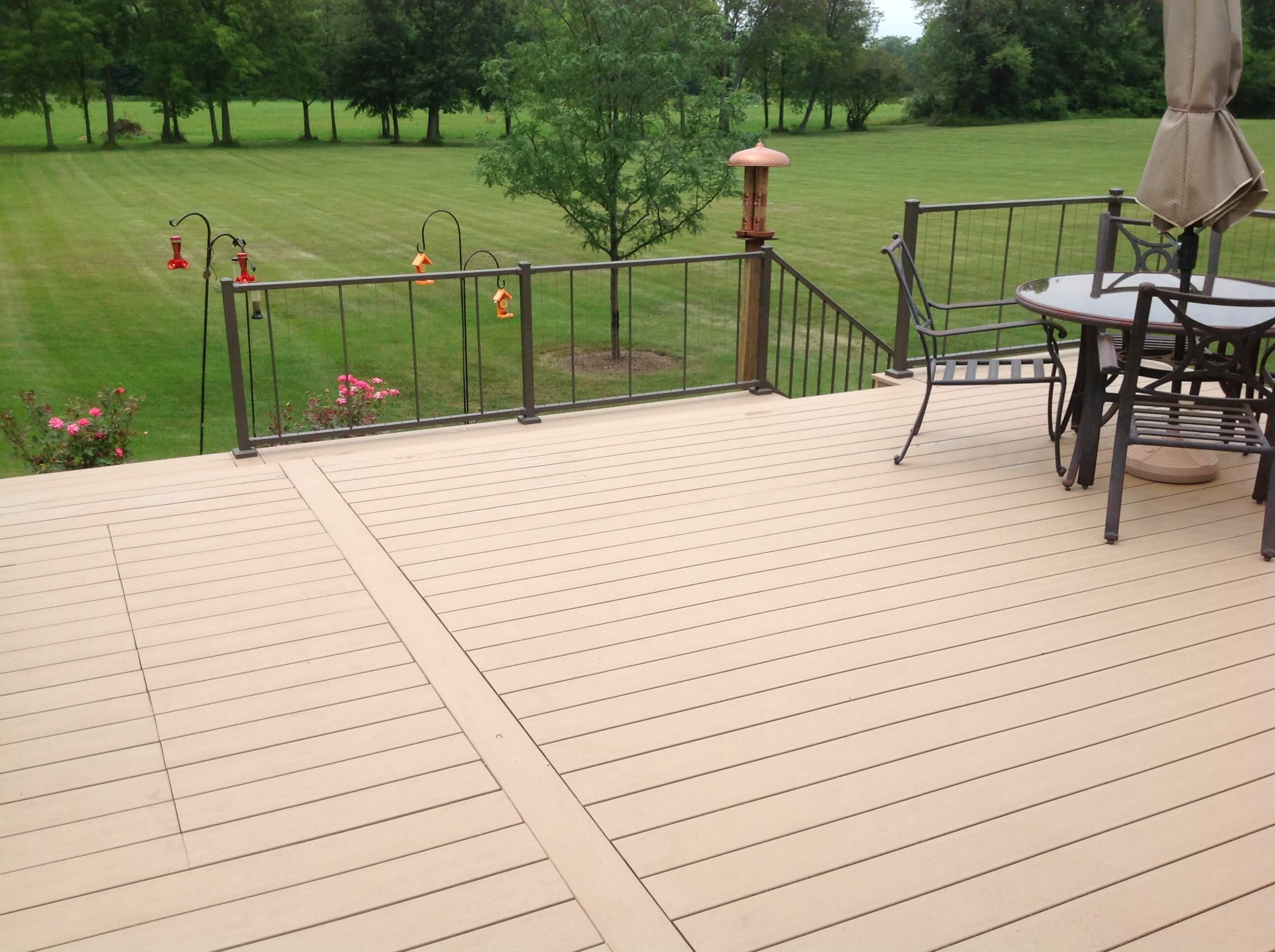A maintenance free TimberTech composite deck will provide years of carefree backyard fun and the Westbury VertiCable Rail allows for a nearly unobstructed view of this homeowner’s gorgeous property.