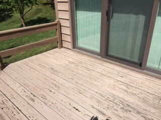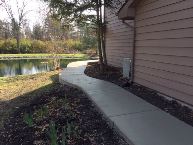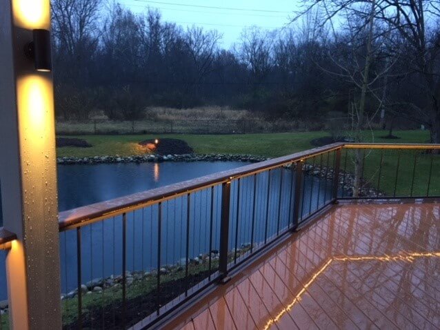 The back yard overlooks a large pond and nature area, but it also faces directly south, and the sun beat up the wood deck and made it uncomfortable to be outside. The owner also wanted the deck to be larger for more entertainment options and wanted it to wrap around the side of the house to service a large patio door that had never been used.