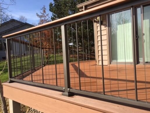 She decided on the Azek Vintage Collection Decking in “Cypress” with “Dark Hickory” picture frame border. The pressure treated joists were set at 12” on center and the decking was laid in a diagonal pattern. The aluminum railing was Westbury VertiCable in “Bronze Fine Texture” to make sure the views were unobstructed as much as possible. For the security of the many small children that are part of the family, gates with spring hinges were specified at both openings to the deck. A drink rail from matching Azek decking was incorporated on top of the Westbury rail around the entire perimeter of the deck.