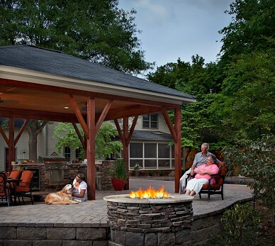 You know the benefits of adding a combination of outdoor living structures, whether it’s a porch and deck, a deck and patio, or perhaps all three. Add a fire feature and seating walls to that patio and you have best of all worlds, and it’s all in your back yard.