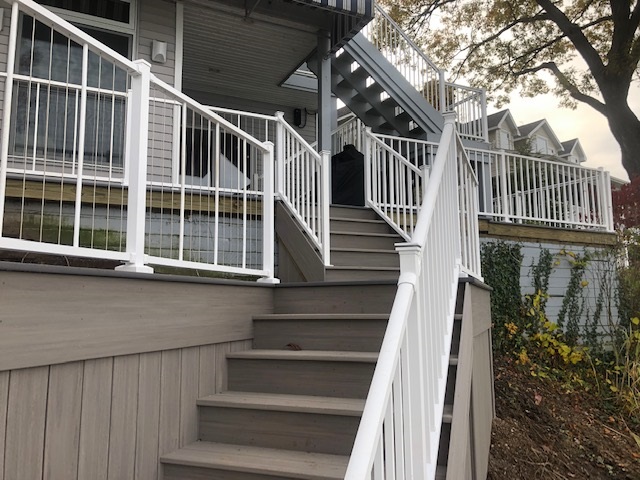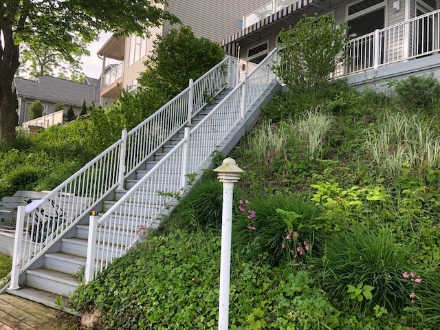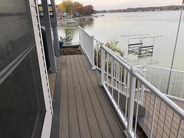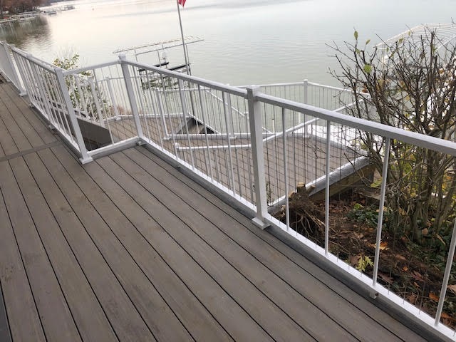 For safety as well as accessibility, we installed vertical railing across the lake view side of the deck. Tuscany rail was used on the other descending areas.