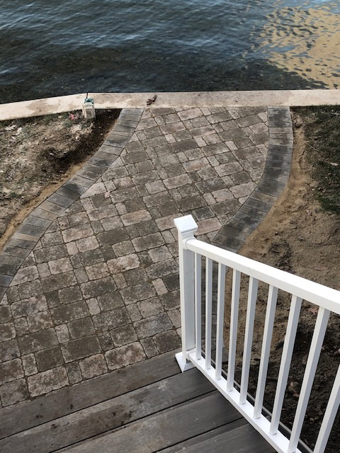 Well, for starters, this Lake Gage lakeside home is truly magnificent in every way possible. The majestic three-story structure sits right at the water’s edge. The only obstacle was the long run of stairs to get down to the lake from the lower level of the home. The homeowners wanted to eliminate that tedious run of stairs by tastefully and strategically breaking up the cascade of steps into an access path that was more manageable and safer.