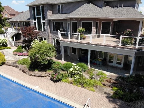 This home’s large elevated deck is actually a stone patio! On the side of the house, it’s level with the home’s driveway, but at the back, the deck/patio stretches out along the second story. The railings we replaced here extended halfway across the back of the house and down steps to the pool area.