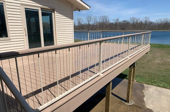 To enhance the aesthetic appeal of this beautiful second level outdoor living structure, we added a picture-framed border for visual interest. In addition, the new railing on this deck is very unique – Westbury Vertical Cable railing in the color Gloss Beige.