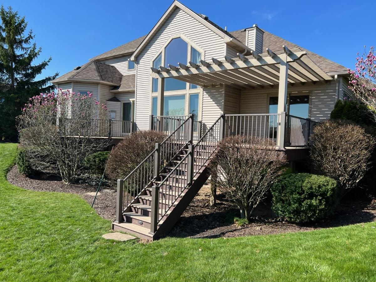Using their Advanced PVC Harvest Collection featuring a Cathedral Grain, the deck floor was built by Archadeck of Fort Wayne, Indiana, in the mocha-looking Brownstone, accented with the rich, ruddy brown color of Kona.