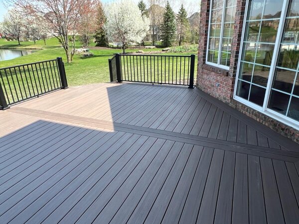 Our second Chestnut Hills custom deck was also constructed with AZEK in the American Walnut color with Westbury black railing. This was a redesign where our expert deck building team expanded the footprint and created a picture frame border, adding a beautiful contrast with architectural visual interest to this valuable home improvement.