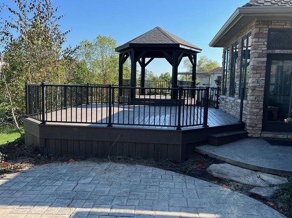 The new design of this reimagined backyard also includes a walk out deck top octagonal gazebo built from pine which was stained using a solid color stain.