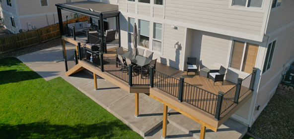 The deck below is a great example of Archadeck’s design capabilities and the many deck customization options that are available to you. This custom deck in Westminster CO offers three distinct outdoor living areas for a variety of uses. The center dining space features a bump-out, so there is also room for grilling. On one side, an open-air space is perfectly situated for a private sitting area. On the opposite side, these clients opted to have a prefabricated aluminum deck cover, which provides partial or full weather protection by way of remote-controlled louvers. This protected area is perfectly suited to an outdoor gathering space with comfortable furnishings. By virtue of this deck’s height and the existing concrete patio, these clients also have flex space below for lounging, or for storing outdoor items when not in use.