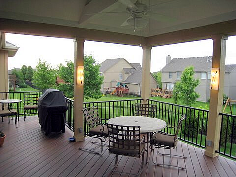 Lenexa KS porch with column lights, TimberTech flooring, and Westbury aluminum railing