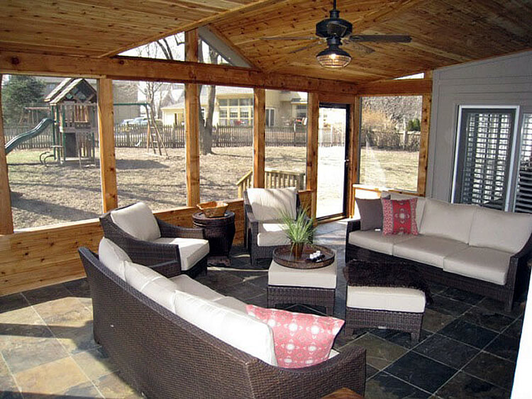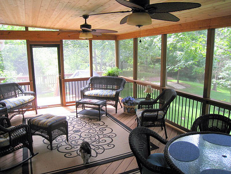 With a screened porch, the central features of the interior design are often the structural components of the porch itself. While your porch will be an extension of your home from a living perspective, it will have its own design identity. It will have different flooring, walls, and ceiling than the other rooms of your house.