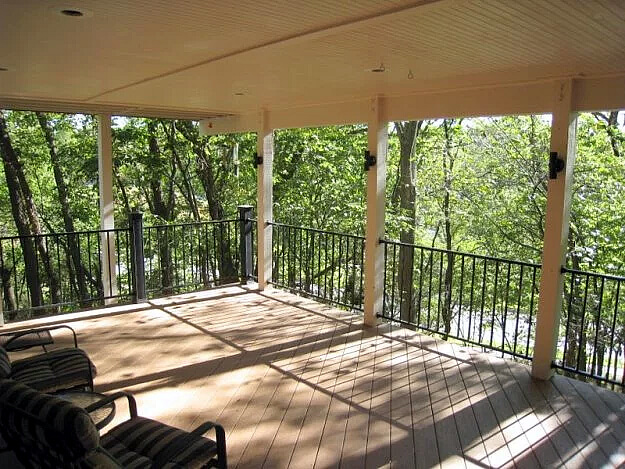 In the image below, take a look at the wide spacing between the columns on this covered porch. The flexibility for widely spaced posts is available on open porches whereas this is much more restricted with a screened porch, 3-season room or 4-season room when window sizes restrict the column spacing opportunities. The elevated porch below has a flat ceiling. Flat ceilings can be selected for a number of reasons including preference or even roof height limitations. The commonly stated concern about a flat roof is the amount of light that will enter the space. You can see that even with this heavily wooded back yard, this porch is flooded with natural light.