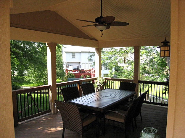 Below is a covered deck in Overland Park KS. Notice the stately wide columns and how they contrast beautifully with the dark stained railing and the slender-profile black pickets. The ceiling of this porch is painted beadboard. You are not limited to natural wood or natural-toned shades. It’s a great design idea to have some elements of your space painted to match your home. Your Archadeck design consultant will work with you to look at numerous design, finish and material options. We’ve built just about every size and used many different materials from many different manufacturers. We care share all of that experience with you to help you in your design decisions.