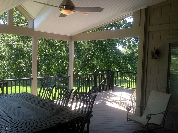 Below is a covered porch in Lee’s Summit MO. These homeowners wanted some sun protection but otherwise wanted unobstructed access to all the fresh air they could get. They also wanted a bright and airy space so they chose a gable roof. This porch includes a number of low-maintenance materials to ensure they can spend their porch time enjoying their porch instead of performing maintenance on it. The porch flooring is AZEK decking and the railings are low-maintenance aluminum.