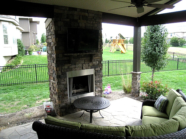 If you’re considering adding a new outdoor living space, there are many covered porch ideas for your Kansas City area home. The open porch below is in Olathe, KS. You may have wondered if you can include an outdoor fireplace in an open porch. Looking at the picture below, you can see that’s absolutely possible and it looks stunning. This covered patio has a low pitch gable roof with an open gable end. The fireplace comes complete with a TV mounted over the fireplace. Take a look at some of the nice design details these homeowners chose. The wide columns are partially finished with the same stone as the fireplace facade for aesthetic appeal and to pull the whole space together.