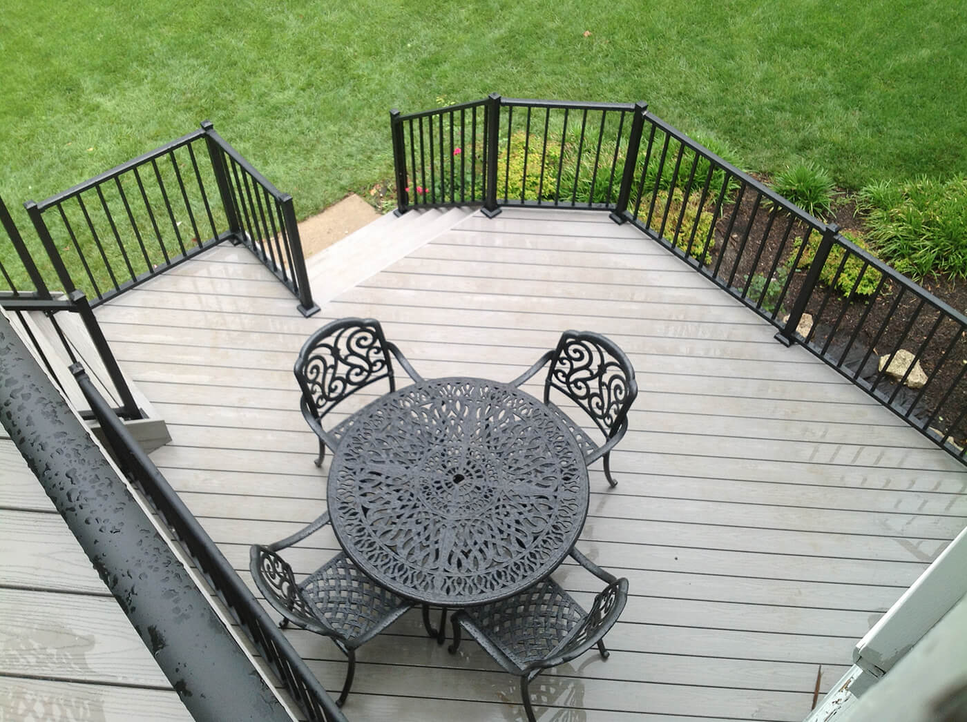Let’s look at railing first. There can be a misconception that railing is more immune to effects of weathering and aging because it’s a vertical structure. This isn’t true. If you choose wood railing, it will still suffer under the constant pressure from sun, precipitation and freeze/thaw cycles. It will still fade, splinter, crack, cup, twist and warp the way any wood used for outdoor building will withstand the test of time outdoors. To make it worse, it can be difficult to perform railing maintenance. This may require ladders to maintain the outside edge of the railing and is often difficult to powerwash, stain and seal each of the individual spindles. When you choose low-maintenance railings such as vinyl, aluminum, iron or cable, these materials will not suffer the degrading effects of being used as outdoor building materials.