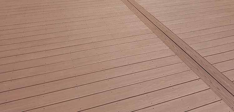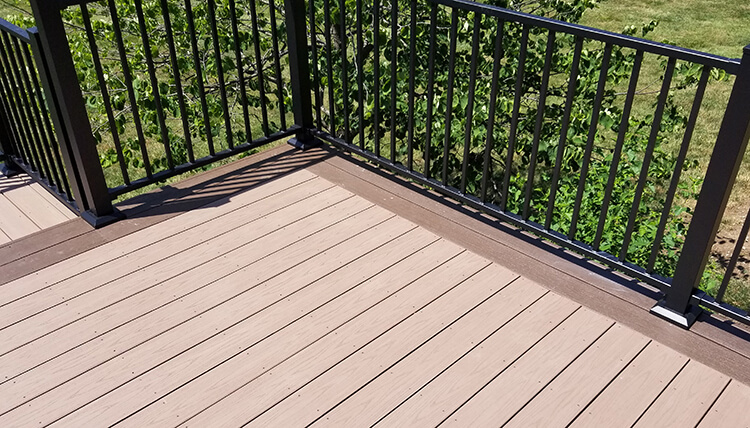 AZEK composite decking was the choice product for this project, in two complementary warm walnut brown tones. Autumn Chestnut, a softly-muted brown, was installed as the main decking boards color. Acacia, a more richly-toned and saturated brown, was utilized as parting boards to eliminate perpendicular seams and as ribboning for a more custom, visually appealing finish. As a premier AZEK deck builder in Olathe, KS, we can design such custom options that will set your new deck apart.