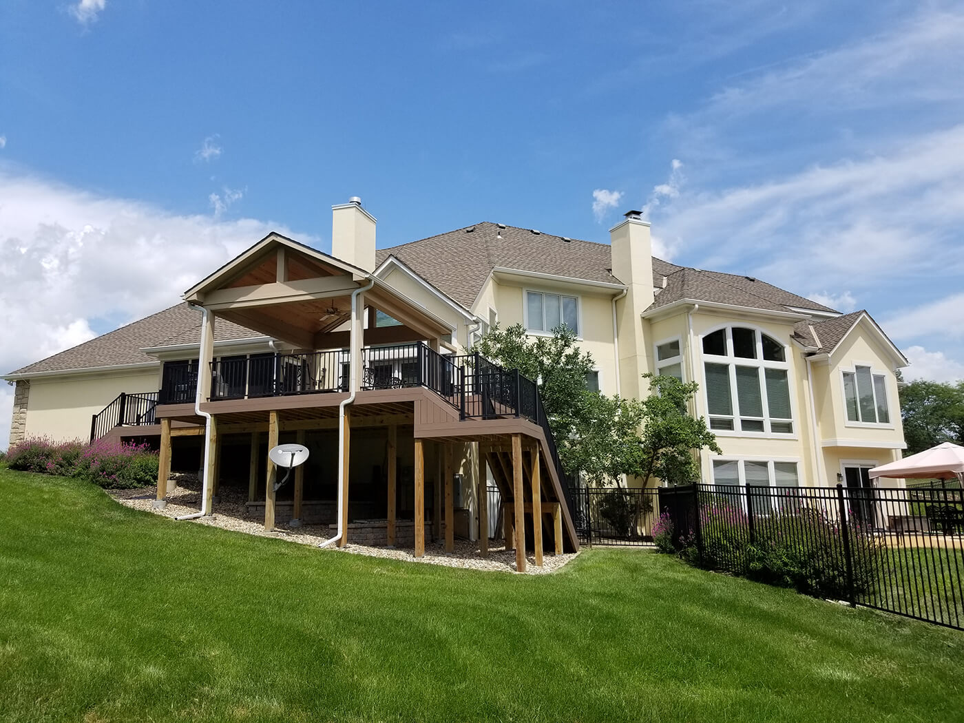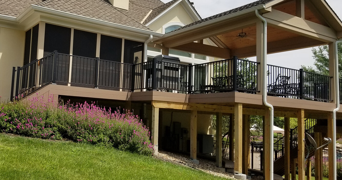If your deck is old, tired, and requires annual maintenance, you may want to consider a new deck utilizing updated low-maintenance materials. These homeowners in Johnson County KS selected low-maintenance synthetic AZEK decking for the deck. The narrow-profile black aluminum railing pickets ensure maximum visibility from the deck to the yard beyond. In addition to replacing the deck, these homeowners also decided to add an open porch to cover a portion of the deck, leaving other areas of the deck open to full sun exposure.