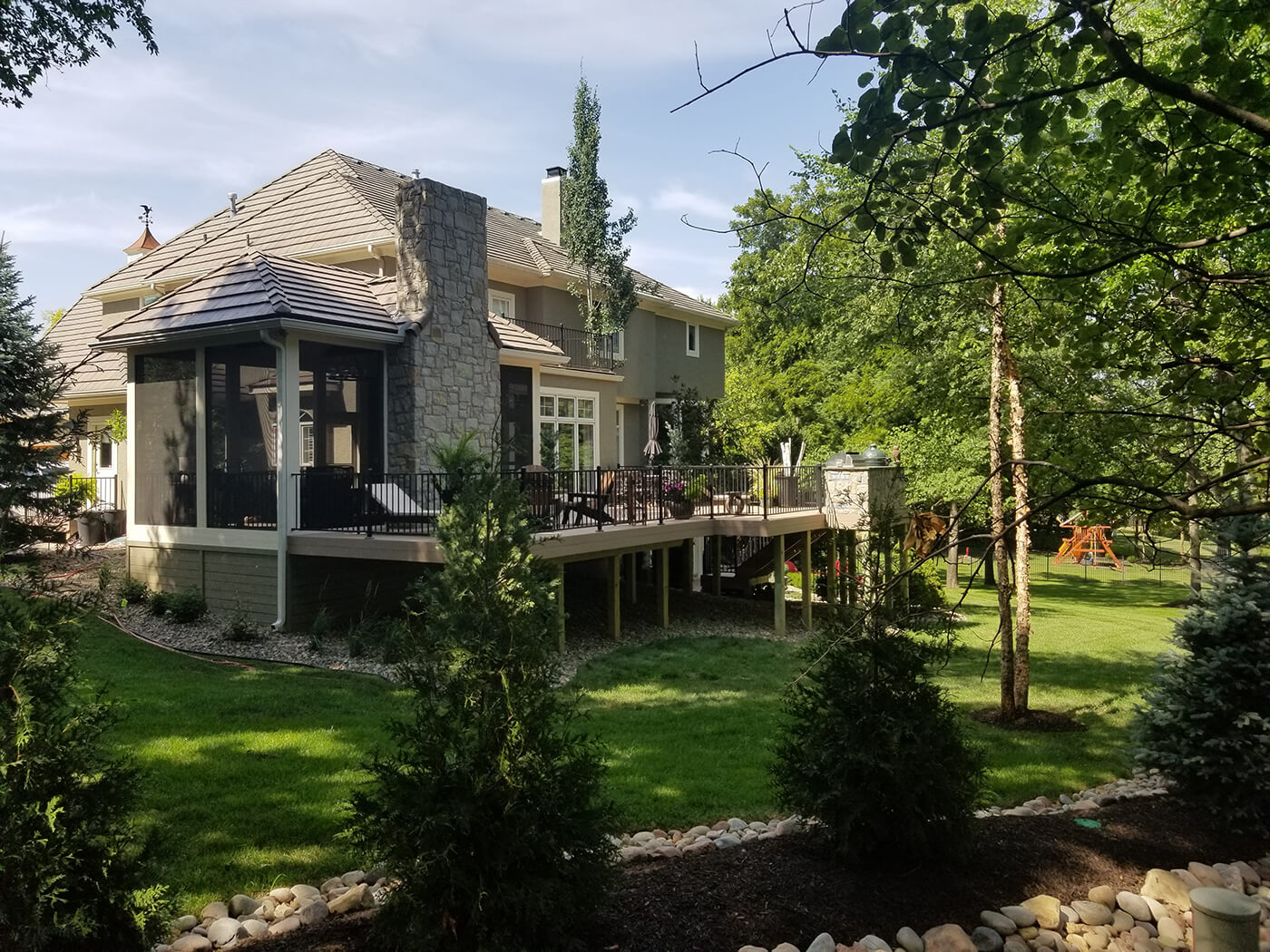 When we originally met these Overland Park homeowners, their outdoor space consisted of an existing open porch along with 2 decks. The owners acknowledged that the current design was flawed and clumsy. They wanted to start from scratch and build their dream outdoor living space. Their new space includes a screened porch with an outdoor fireplace, an AZEK low-maintenance deck and an outdoor kitchen. Let’s take a look at each of the spaces and some of the great design details.