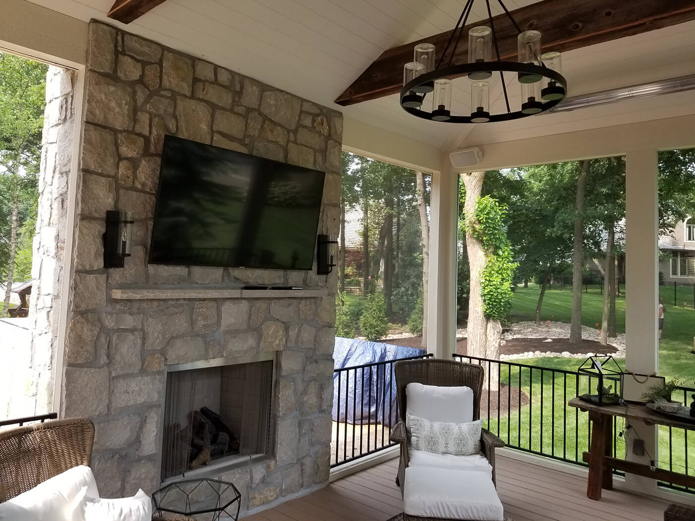 Early on in the design process for a new screened porch, one of the key decisions is the shape of the roof. We suggest that the roof shape either match or complement the roof shape(s) of the existing home. This home has a number of hip rooflines. We designed this porch to include a hip roof. Another key exterior porch design feature is the stone chimney facade. The owners wanted a stone facade both on the chimney’s interior and exterior. Often, homeowners will finish the interior fireplace facade but may leave the exterior chimney finished less formally. Since the family’s new AZEK deck abuts the exterior chimney, they wanted to also cover the exterior with stone.