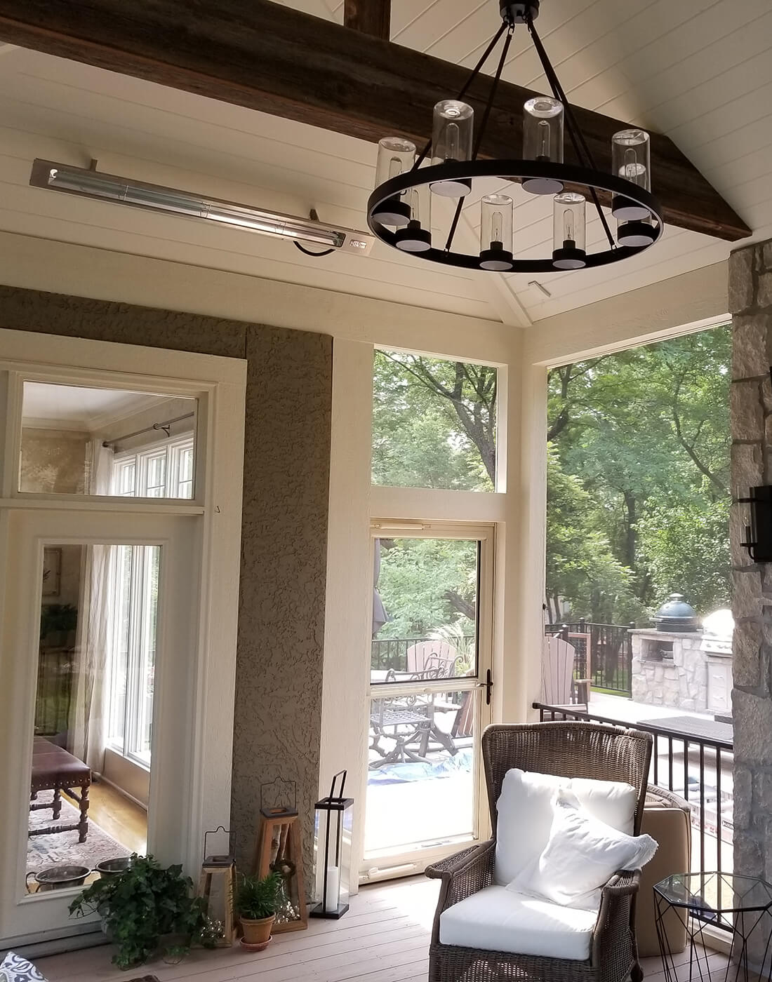 The posts are wide creating a very grand and statuesque feel. Radiant heaters are installed in the porch interior. The heat generated from these high-performance heaters along with the heat generated from the fireplace can likely keep this room at a comfortable temperature 10 or 11 months out of the year. A beautiful chandelier ties together the dark design accents including the sconces on the fireplace.