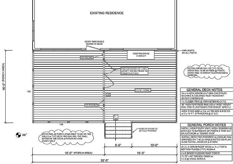 Custom design features for this Blue Springs screened porch and deck include AZEK Autumn Chestnut deck and porch flooring, bronze DekPro™ aluminum railing, AZEK drink rail cap with lighted railing post caps, and PetScreen® screening. These homeowners had something special in mind for their new porch and sought out a solution. We will be installing screened French doors for ease of use and a classic designer touch.