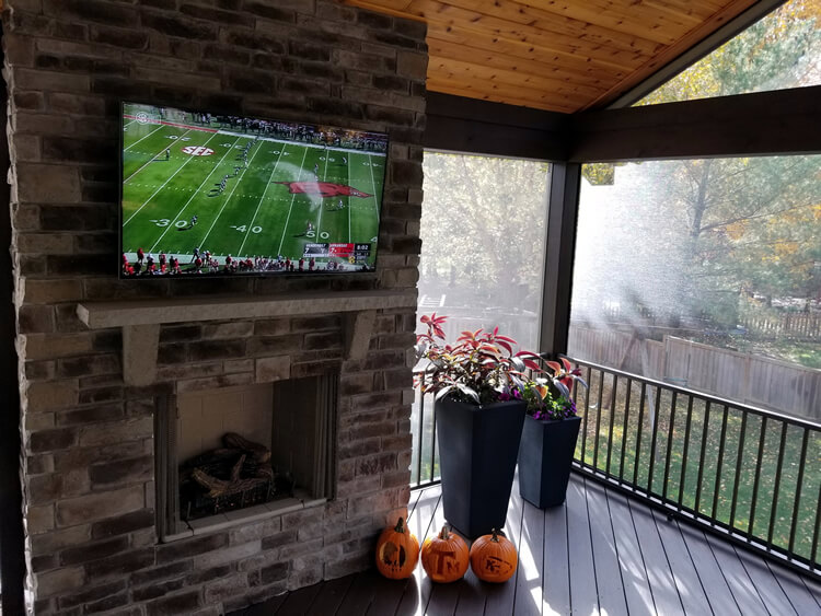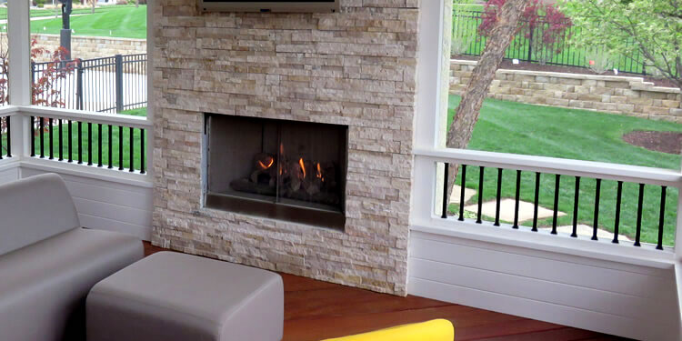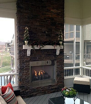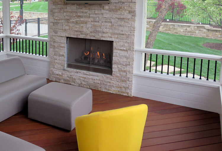 If you are considering ways to create the feeling of seclusion, away from prying eyes of neighbors, a fireplace by design, will offer the privacy you seek. An outdoor fireplace facade, built floor-to-ceiling, in a conspicuous area of your new outdoor living space will offer separation from neighboring backyards. If you decide not to include a fireplace, we can still build a privacy/TV wall to achieve the desired effect. Notice the separation given by the stone fireplace on this Lenexa, Kansas, condominium’s screened porch.
