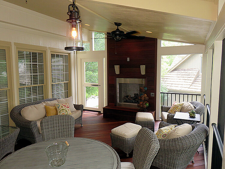 Modern outdoor fireplace on screened porch