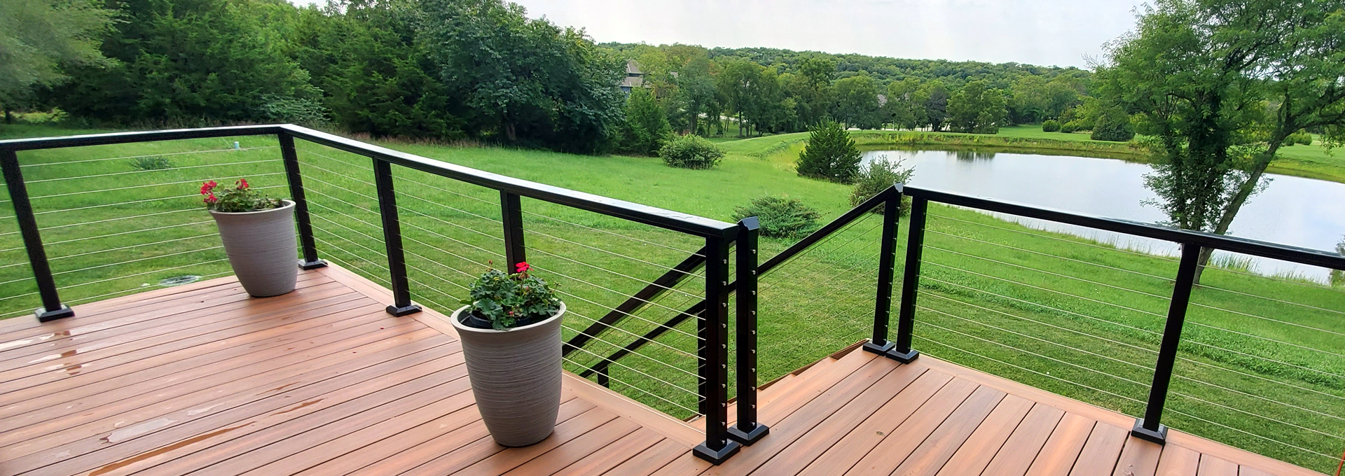 Not all deck builders in Olathe KS offer truly custom design options. Nor do they partner with the best decking brands in existence. Archadeck of Kansas City does both, and then some! We build with brands like TimberTech AZEK and Fiberon, which is the decking brand used in the project below. This deck project in Olathe not only includes true wood-look decking, which is guaranteed not to peel, splinter, fade, or stain, but it also includes low-profile, aluminum-framed, stainless steel cable infill deck railings.