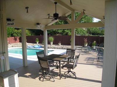 The Kansas City area porch design you see below is attached to a pool deck. The deck/porch flooring is made by AZEK. It’s a PVC low-maintenance decking material that has a very strong warranty. The open porch includes lighting, a ceiling fan, and even heating elements.