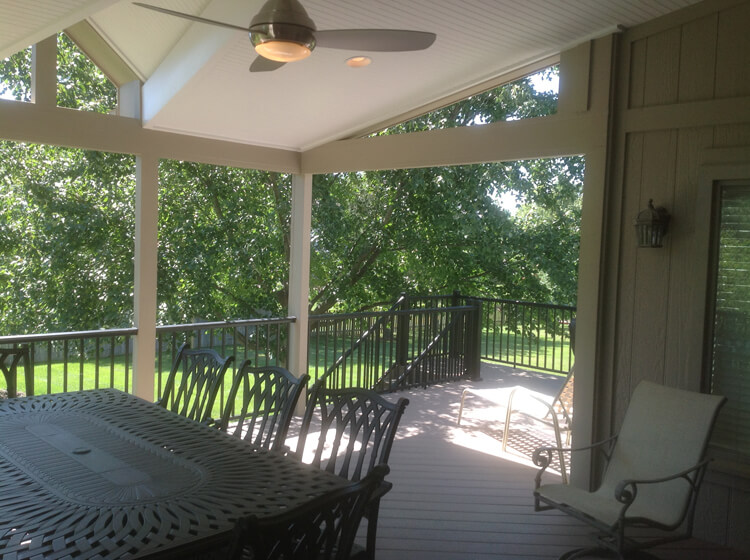 If you are looking for a truly custom deck design, choose Archadeck of Kansas City for your next project. Our custom composite deck designs are rarely simple rectangular appendages but are more often true living space extensions. Whether you plan to entertain on your new deck or hope to create a quiet space for private relaxation, Archadeck of Kansas City will design the perfect deck for your needs. As you can see in the photo below, our decks are as uniquely customized as our porches.
