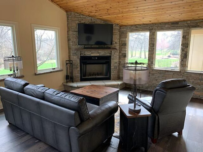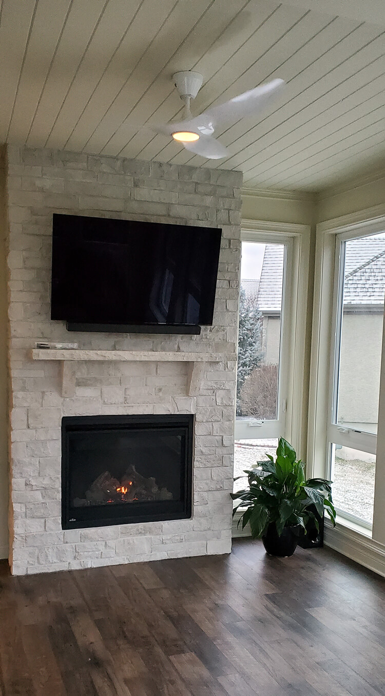 If you desire a new living space, which can be utilized all year long, no matter the weather, consider a new sunroom home addition. Our custom Overland Park sunrooms feature floor-to-ceiling windows, insulated walls, heating and cooling, and often also include stacked stone fireplaces and low-maintenance plank or ceramic tile flooring. The sunroom below features a ship lap ceiling, and all-white design motif for a bright and airy feel, even though it is completely enclosed and protected from the elements.