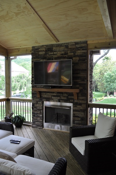 Screened porches are sometimes referred to as three season rooms here in Tennessee. These type of porches can be finished with a variety of flooring options such as traditional wood, tongue and groove flooring and low maintenance composites like AZEK, TimberTech, and Trex. The added protection from the screens affords interior finish options that lend an interior room feel to your space. Among the long list of options are beadboard ceilings, electrical packages, sound systems, integrated outdoor fireplaces, TV mounts and much more.