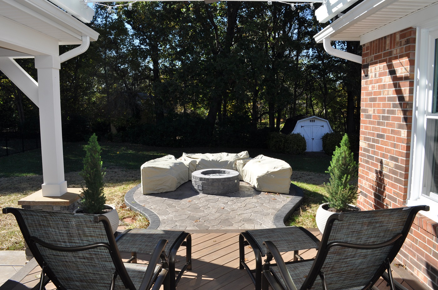 Marrying a patio with a screened porch or Eze Breeze porch expands use of your backyard beyond the warm season and protects you and your guests from nuisance insects as well. The design shown below features a custom patio with integrated fire pit, deck and screened porch — what more could you need with an amazing space like this?