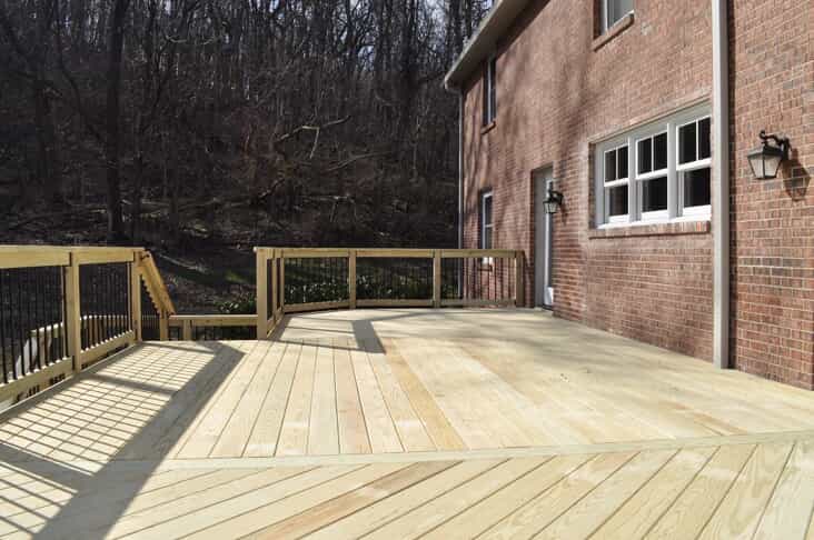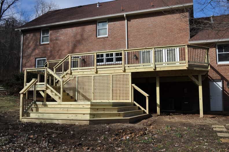 — This Oak Hill wooden deck remodel compliments the classic brick home.