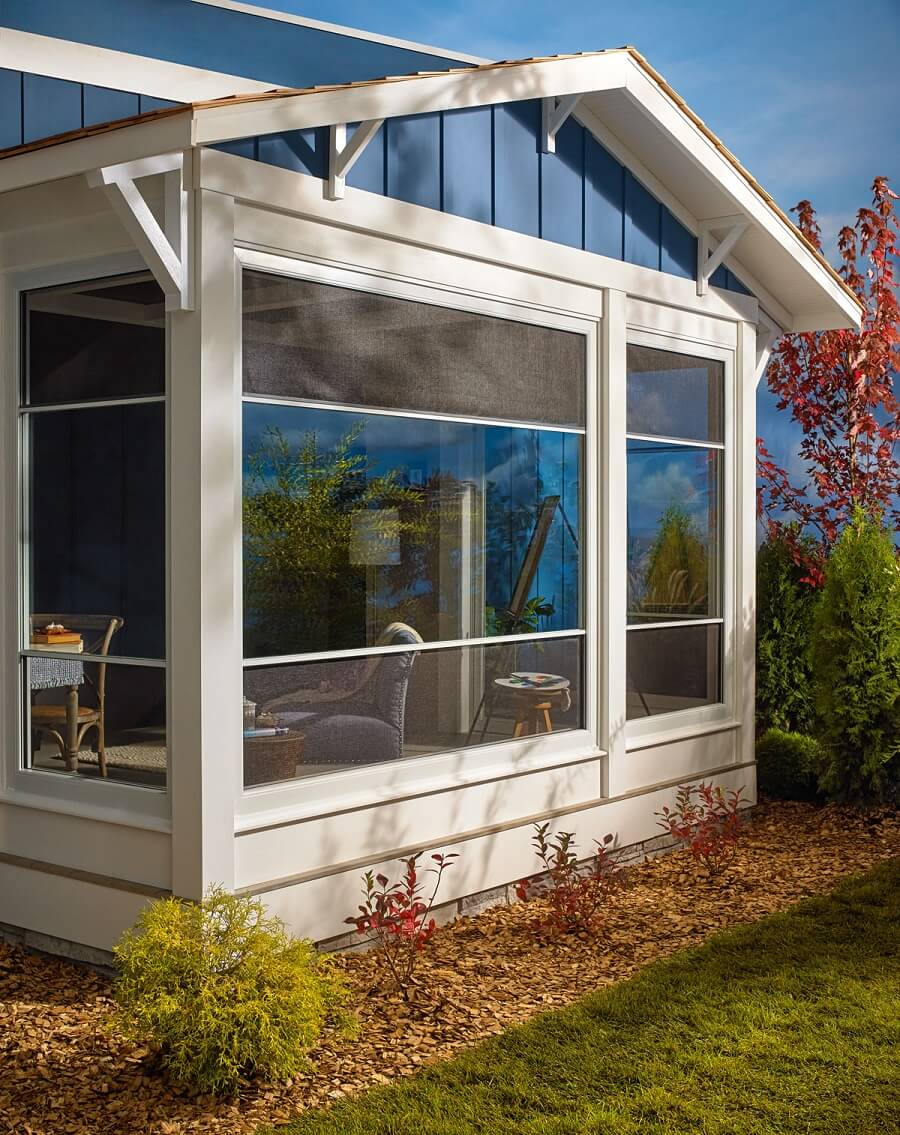 Scenix Porch Windows are made of sliding glass panels and retractable screens. They offer more of a sunroom feel, but they don’t offer the flexibility of removing the glass panels entirely.