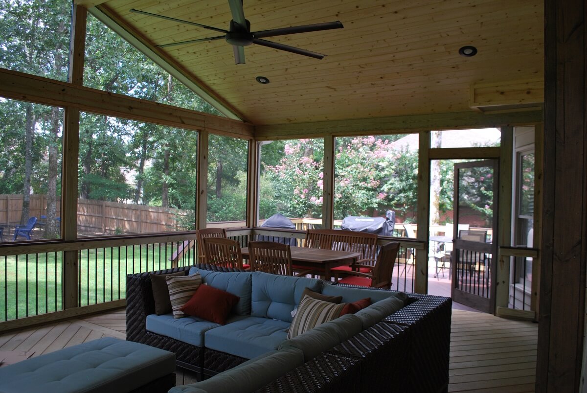 Thoughts of a screened porch may conjure up childhood memories of warm summer nights when the air was completely still. Today, we wouldn’t think of building a screened porch without at least one ceiling fan! Let’s look at benefits and drawbacks of choosing a screened porch.
