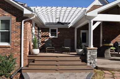 This stunning outdoor living space combination features the best of both worlds; a covered area for protection and a deck for open-air outdoor living. The open-air area features a low-maintenance TimberTech with riser lights and a floating overhead pergola.