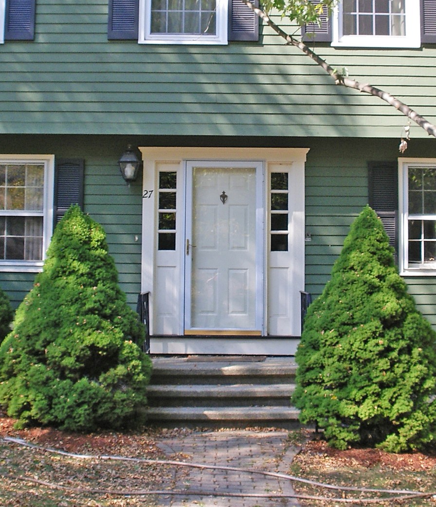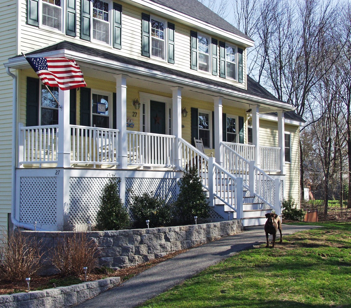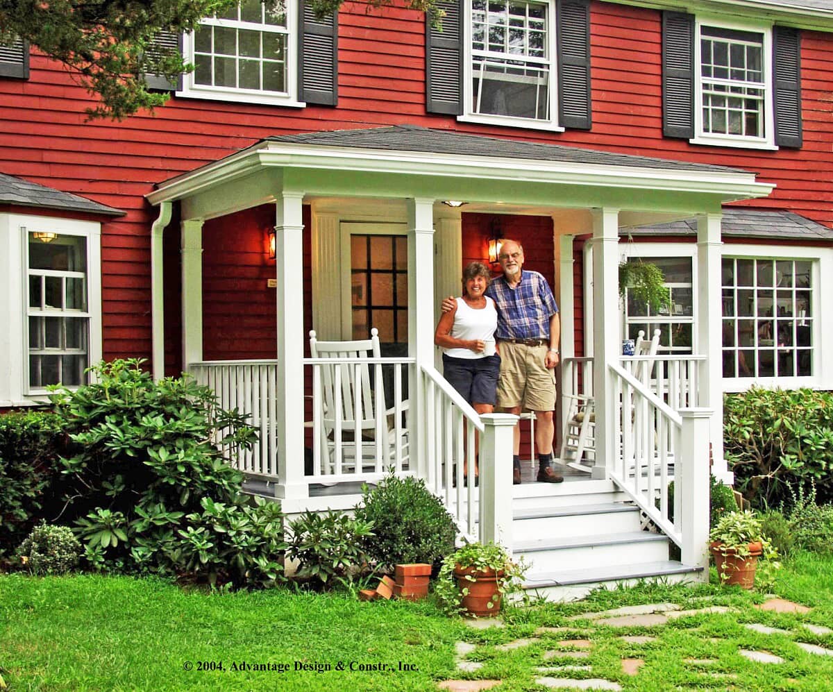 This traditional front porch in Lincoln, MA, is an excellent example of the power of a porch to transform a home’s appearance. It’s also an example of the way our work stays true to a home’s original architecture. The porch is large enough for the homeowners and a couple of friends to sit comfortably but not large enough to overpower the home’s classic appearance. As you can see, we were careful to keep the porch features proportionate to the house. Even the pitch of the porch’s hip roof mimics the home’s main roof. Elements that you can’t see here include 6” wide pine flooring and a flat beadboard ceiling, just right for this 19th Century home. Look at the amazing before and after transformation below.