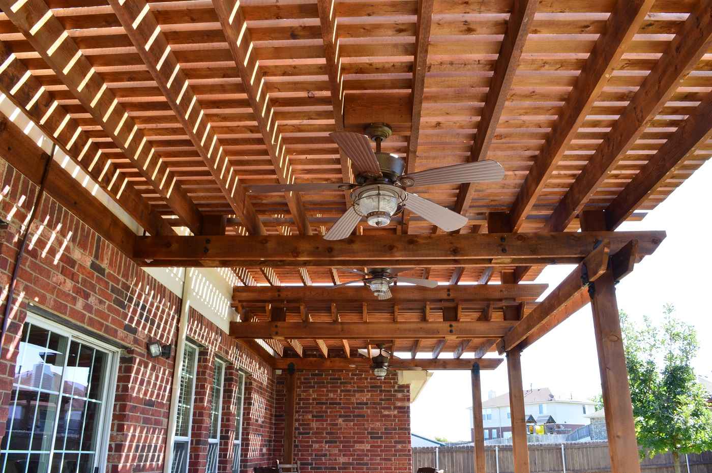 A porch roof would provide more shade than a pergola does, but it would also reduce the amount of natural light coming into the home through the living room windows. The homeowners love the bi-level pergola design because it changes the play of light on the interior of the home. For light outdoors in the evening, the three ceiling fans have light fixtures with dimmers.