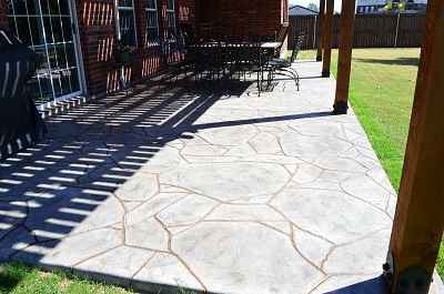 For the patio design, they selected a flagstone pattern stamp and chose slate-gray concrete with a charcoal stain. Stained and stamped concrete has texture and depth that makes it infinitely more visually appealing than unadorned poured concrete. The larger patio gives the homeowners room for their grill, an eight-seat dining table and a pair of rocking chairs.