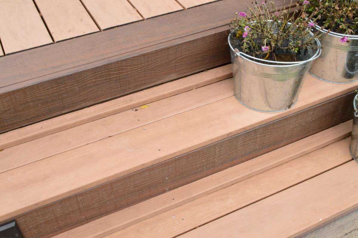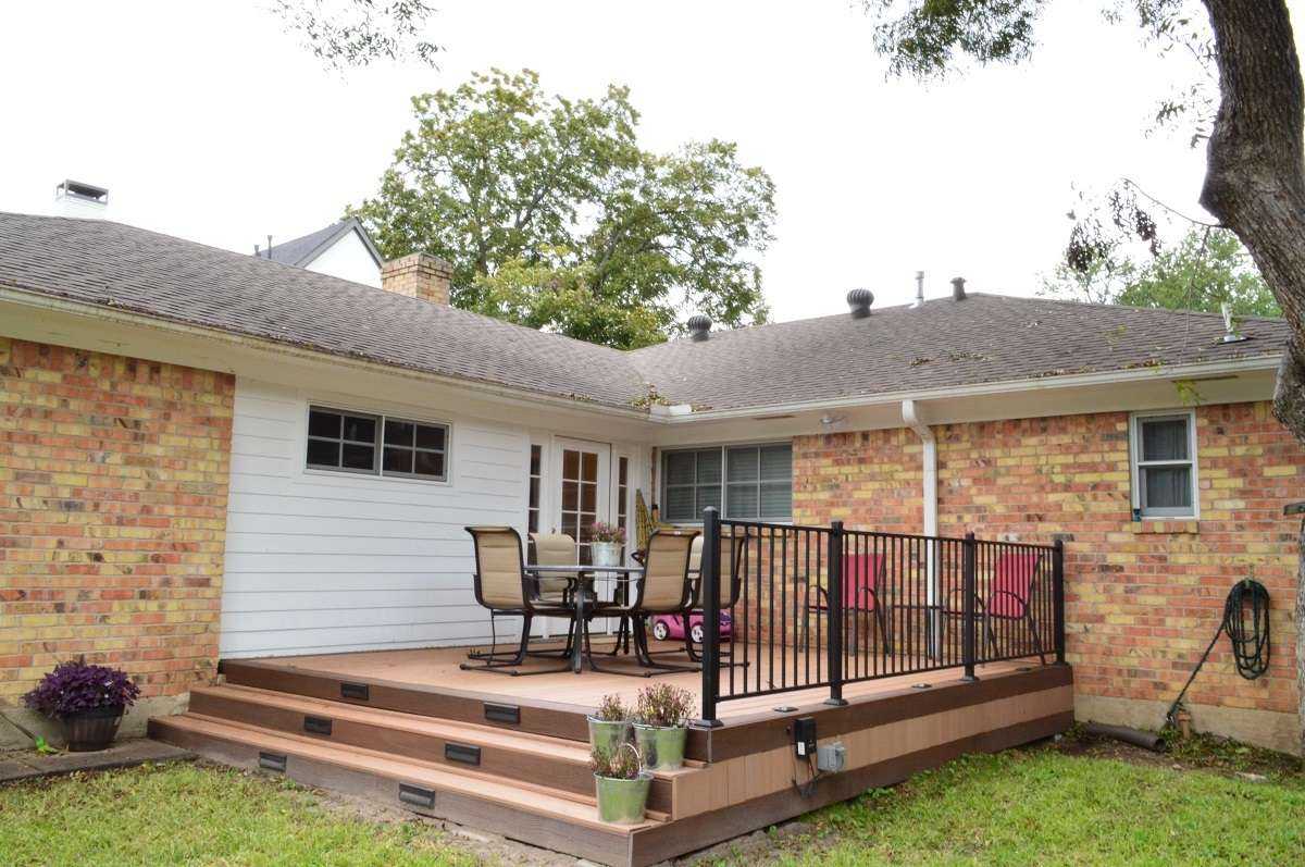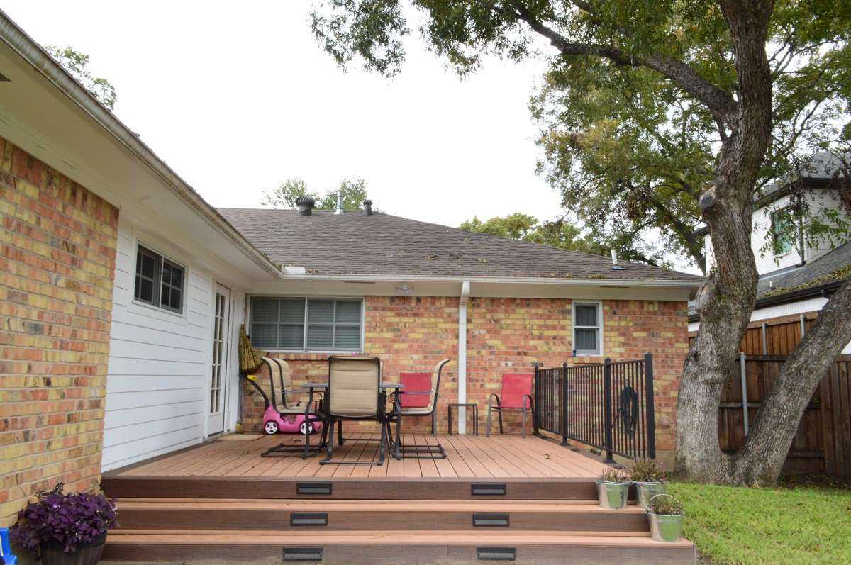 — Two-tone, low-maintenance Dallas deck and railing with low-voltage riser lights.