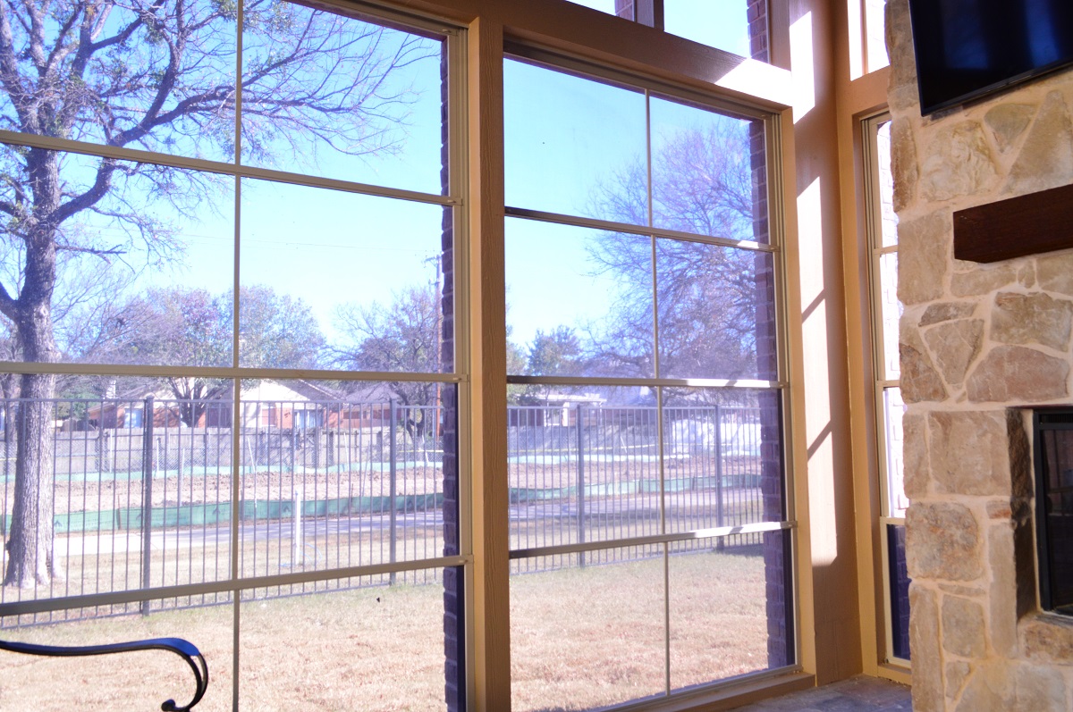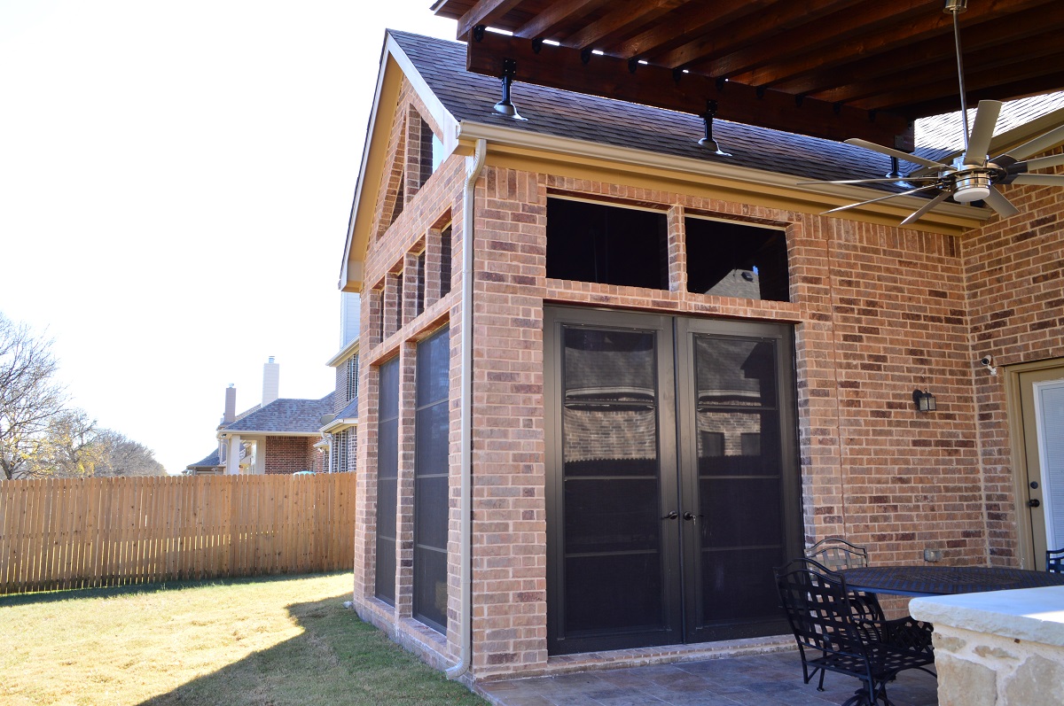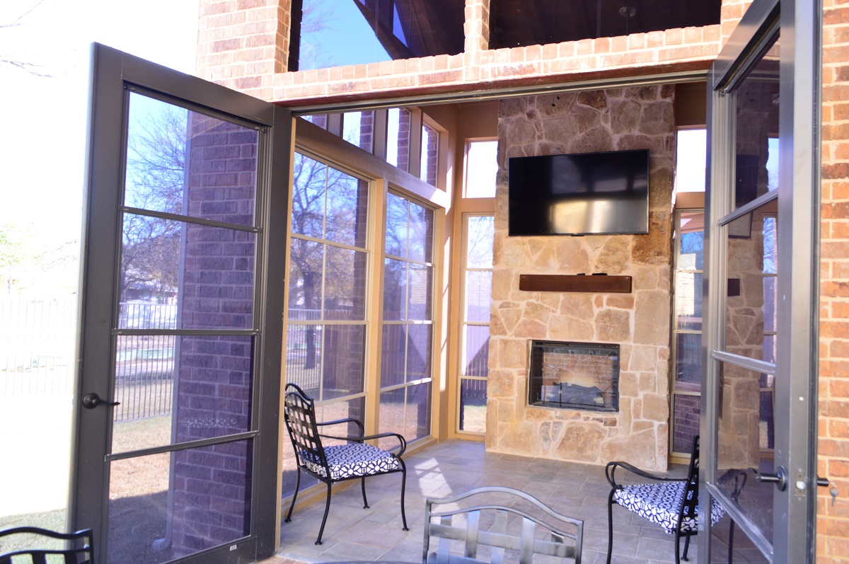 We’ll begin with the custom Eze-Breeze 3-season room. We were able to attach the outdoor room to the home, matching the gable roof line of the existing home. Important to the addition of a new 3-season room is materials matching. Archadeck of NE Dallas-Southlake carefully matched the existing home’s brick and Hardie board siding and trim to create a cohesive aesthetic. The homeowners chose complementary colors for their Eze-Breeze windows, with beige trim and smoke grey screens. The interior of three season was custom designed with a stain and stamp patio floor in Ashlar Slate pattern, chopped Oklahoma builder stone, custom walnut-stained cedar plank mantel, and a Western fireplace insert with a remote. Other true custom elements really set this room apart, such as the walnut-stained tongue and groove ceiling, French doors to the patio, and large custom Eze-Breeze window openings. See for yourself how every small design detail works to create a collectively beautiful space!