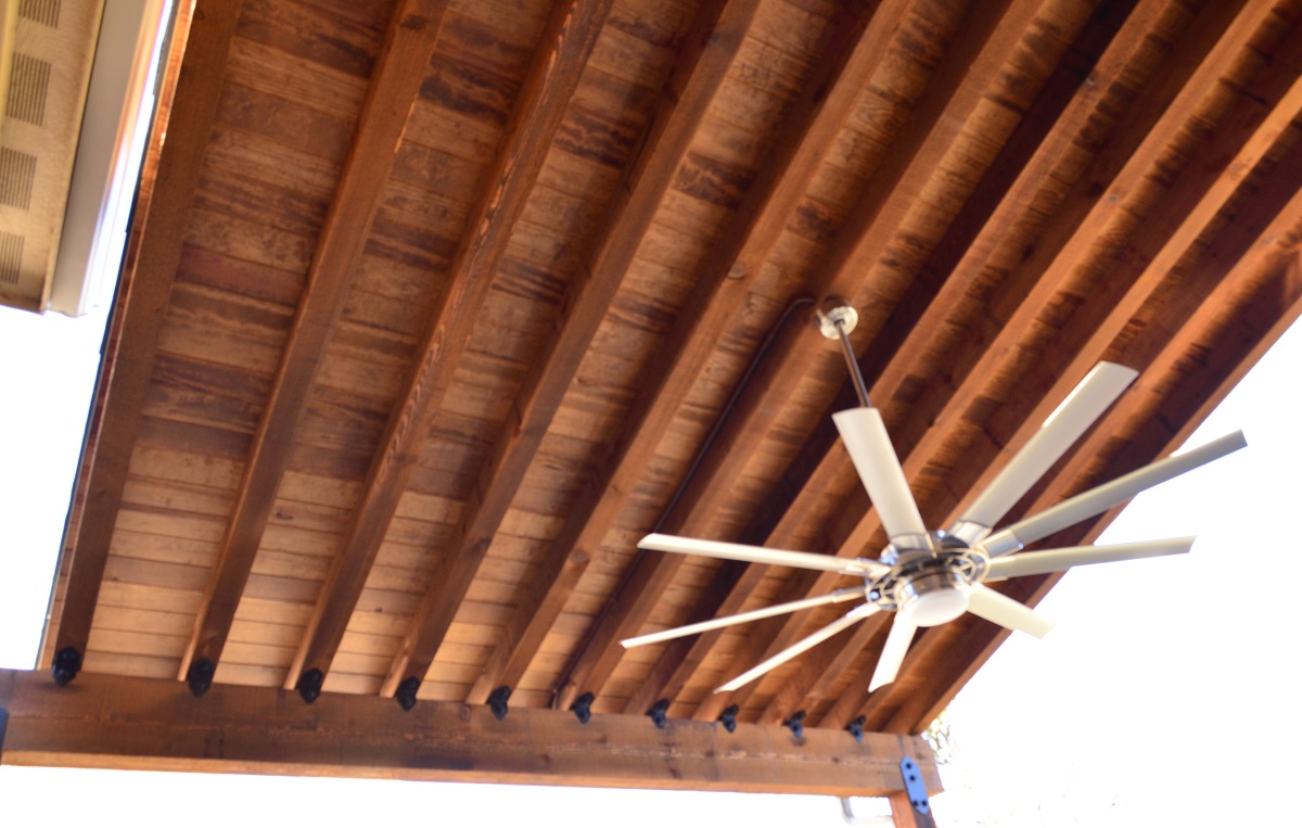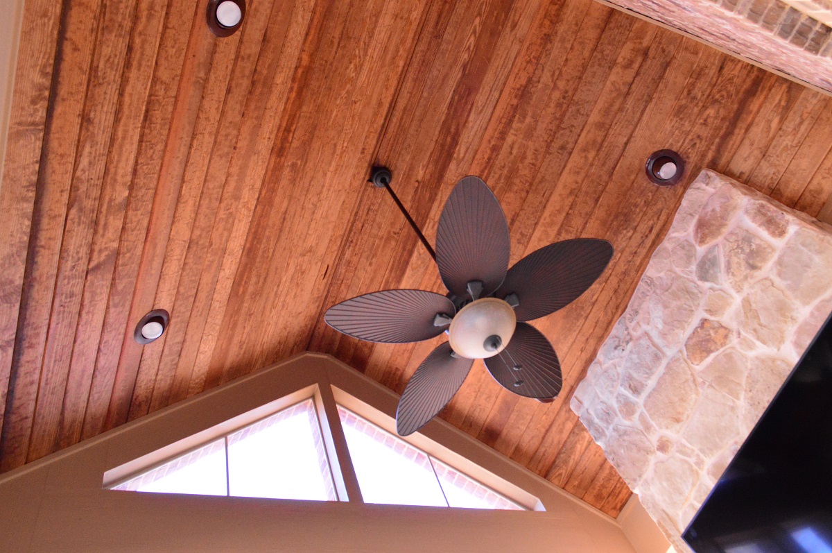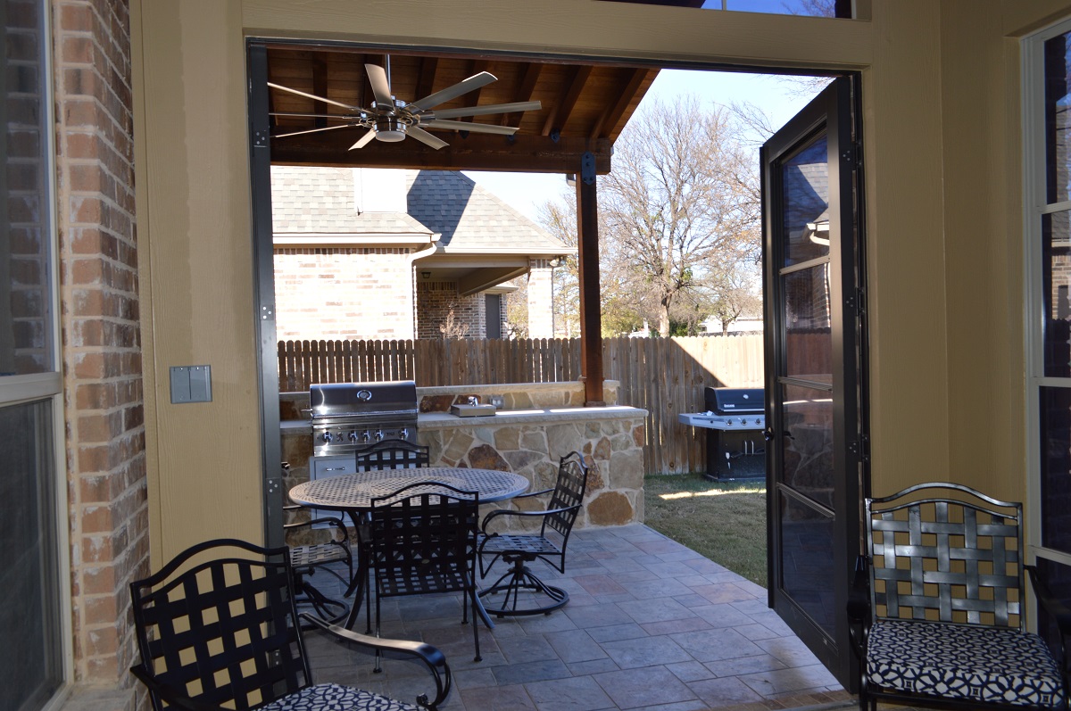— Custom tongue & groove ceiling and a ceiling fan are functional and designer elements on this Fort Worth patio with outdoor kitchen!.