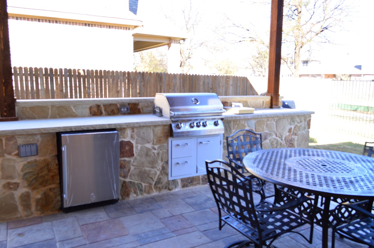 — Custom Fort Worth TX outdoor kitchen with stain and stamp patio and pergola roof.
