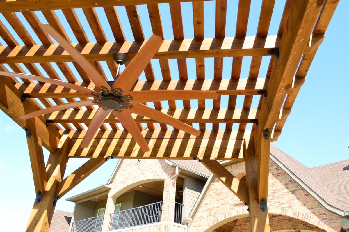 — Cedar pergola with decorative brackets and oversized ceiling fan.
